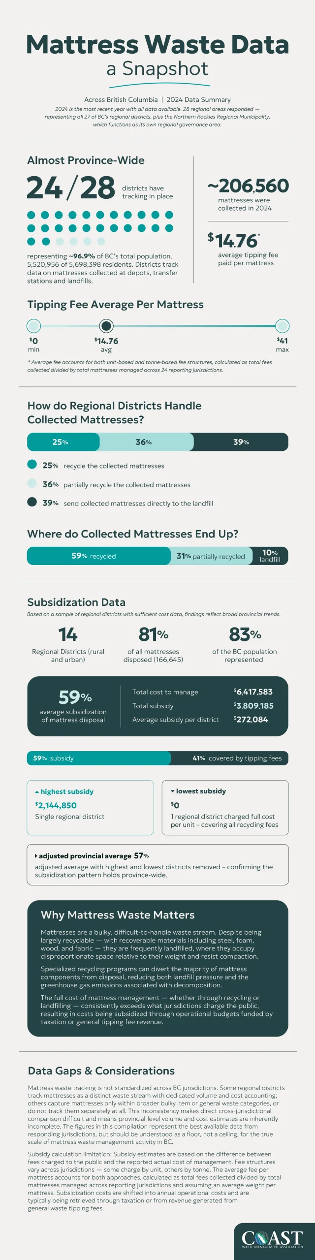 In late 2025/early 2026, the CWMA undertook a Mattress Waste Survey across all 28 key regional areas, and, in conjunction with the BC Product Stewardship Council, conducted an additional survey. The results of this work provide a snapshot of this waste.